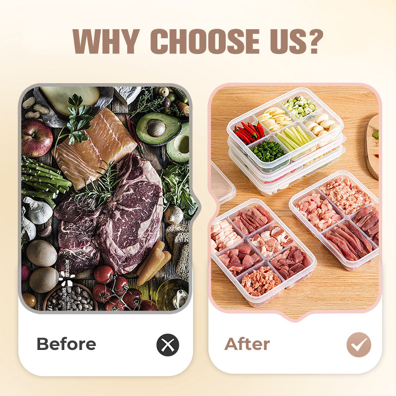 TRANSPARANTE VAKKEN: Houd ingrediënten vers en overzichtelijk dankzij de verdeelde, transparante vakken. Bewaar verschillende soorten voedsel in één bak zonder dat ze door elkaar raken. Bespaar ruimte in de koelkast of voorraadkast door ze op elkaar te stapelen of naast elkaar te plaatsen.