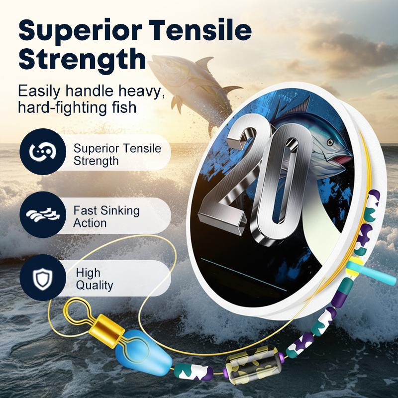 KNOTLESS RIG DESIGN - Deze innovatieve constructie elimineert zwakke punten die doorgaans worden veroorzaakt door knopen, waardoor de oorspronkelijke treksterkte van de lijn behouden blijft. U kunt met een gerust hart grotere vissen binnenhalen zonder dat u zich zorgen hoeft te maken over onverwachte lijnbreuken op de verbindingspunten.
