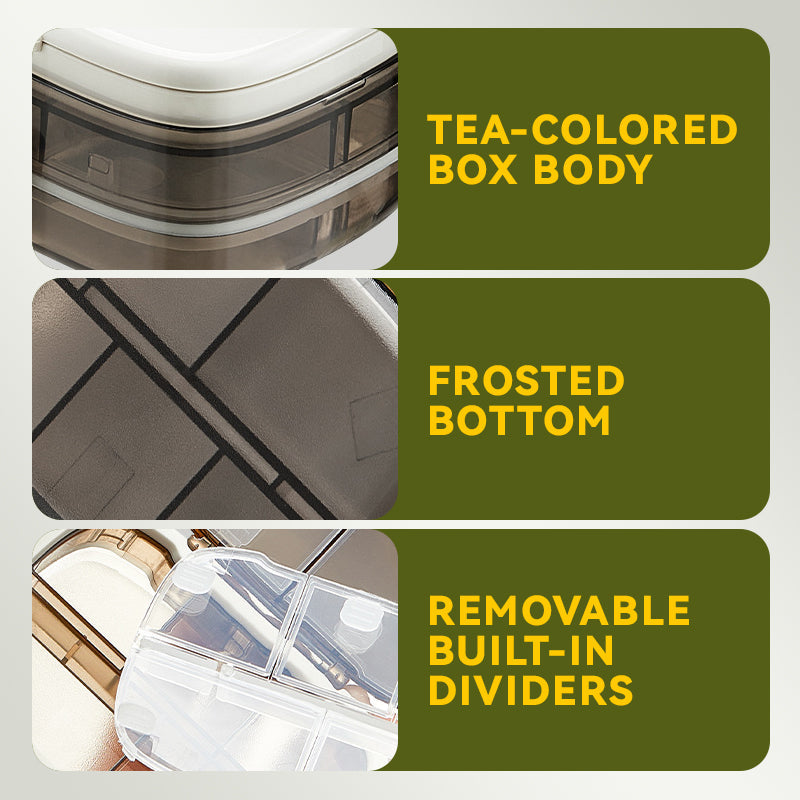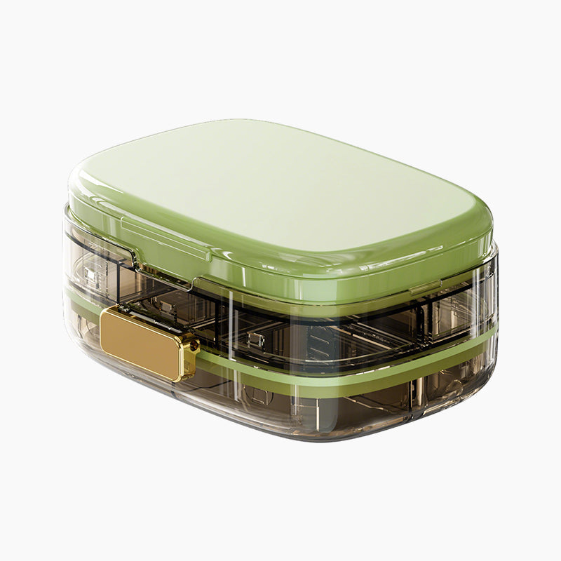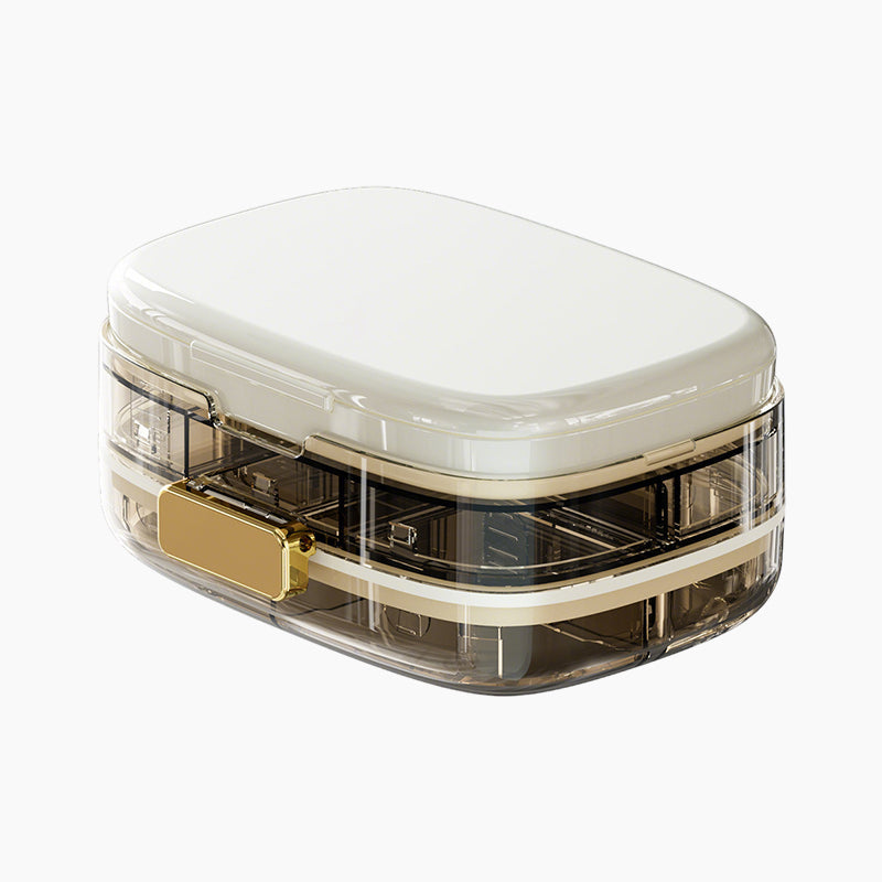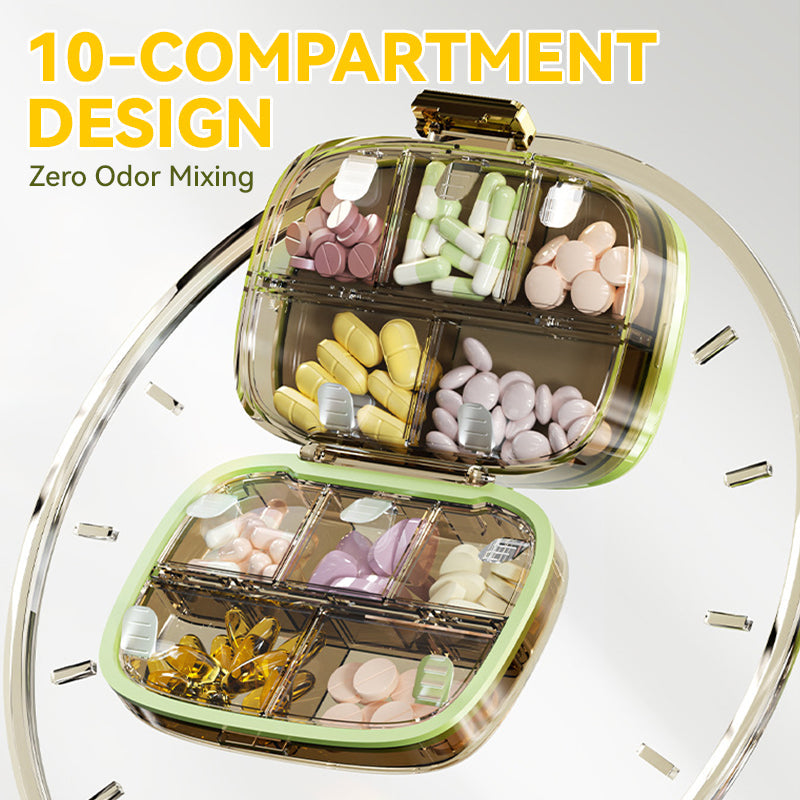 INTELLIGENT ONTWERP MET TIEN COMPARTIMENTEN- Tien onafhankelijk afgesloten compartimenten isoleren verschillende voedingssupplementen volledig. Elk compartiment biedt plaats aan 2-3 standaard capsules of tabletten, waardoor het dagelijkse doseringsbeheer wordt vergemakkelijkt en kruisbesmetting van geuren en smaken tussen compartimenten wordt voorkomen.