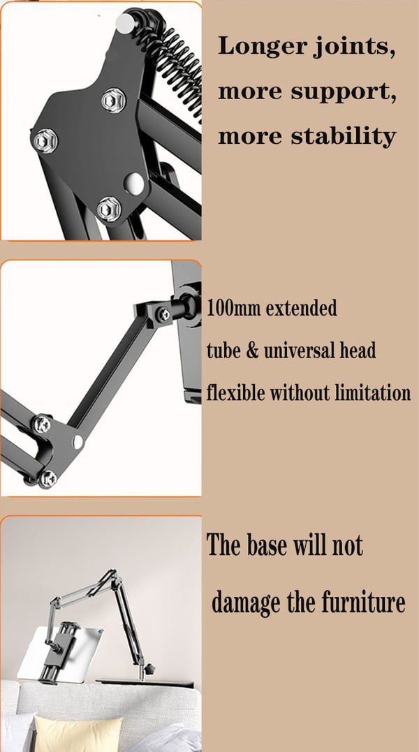 Je kunt hem gebruiken in elke opening of op elk oppervlak, zoals een hoofdeinde, bank of bureau. Je kunt staan, zitten, leunen of zelfs liggen, maak je handen vrij en geniet van deze robotarmstandaard.