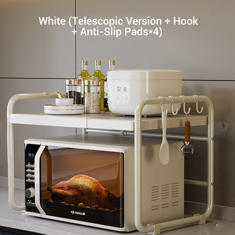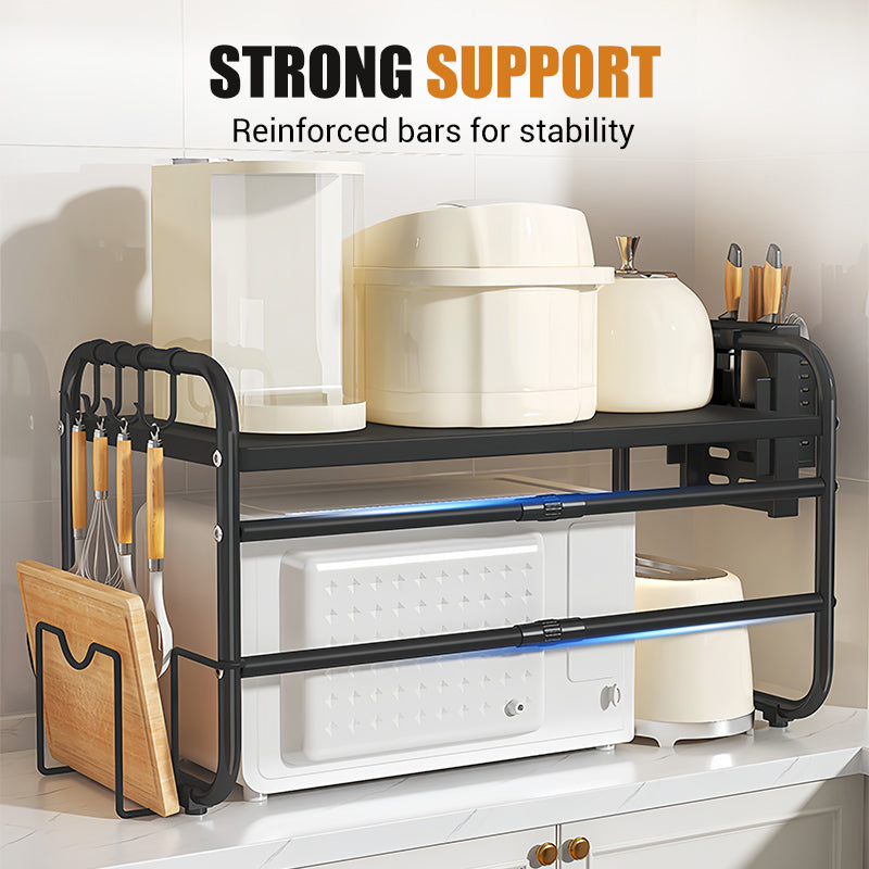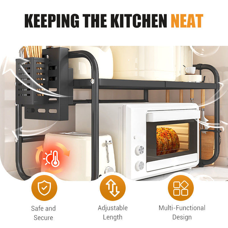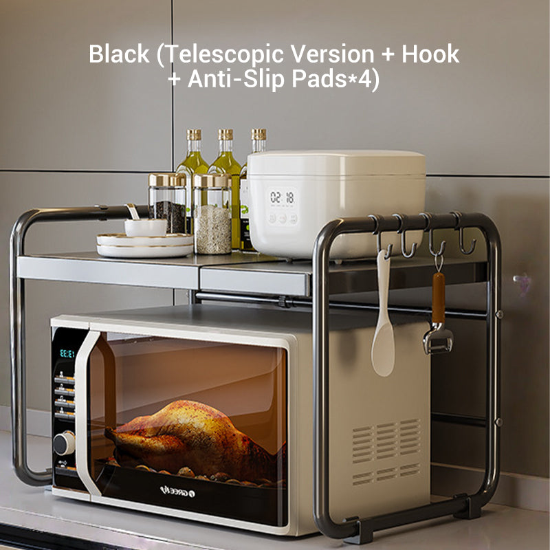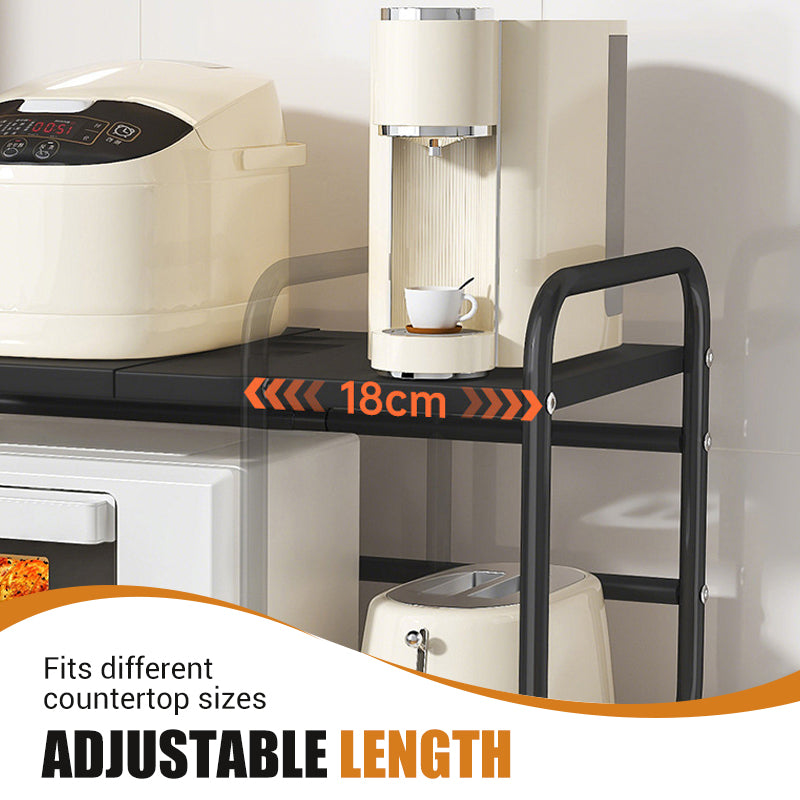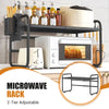 VERSTELBARE LENGTE - Het 2-laags verstelbare magnetronrek heeft een telescopisch ontwerp waarmee gebruikers het frame kunnen uitschuiven of intrekken om perfect in verschillende aanrechtbreedtes te passen. Of uw keuken nu compacte oppervlakken of grotere oppervlakken heeft, de flexibele lengte zorgt voor een optimaal gebruik van de ruimte. De installatie is zonder gereedschap en moeiteloos, waardoor het rek gemakkelijk kan worden verplaatst op basis van de keukenindeling of opslagbehoeften, wat een naadloze oplossing biedt voor ruimtebeheer.