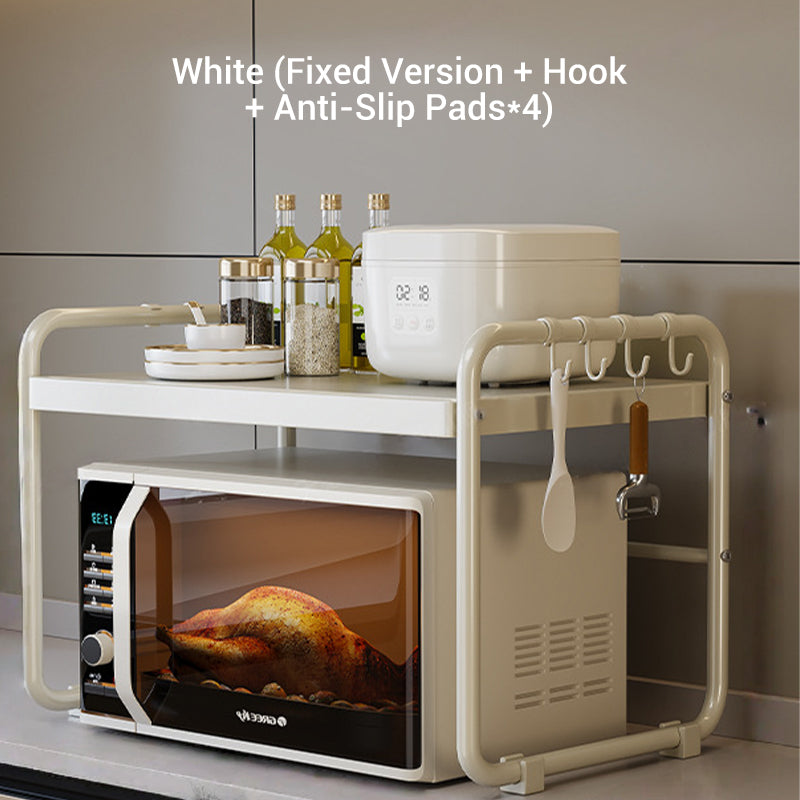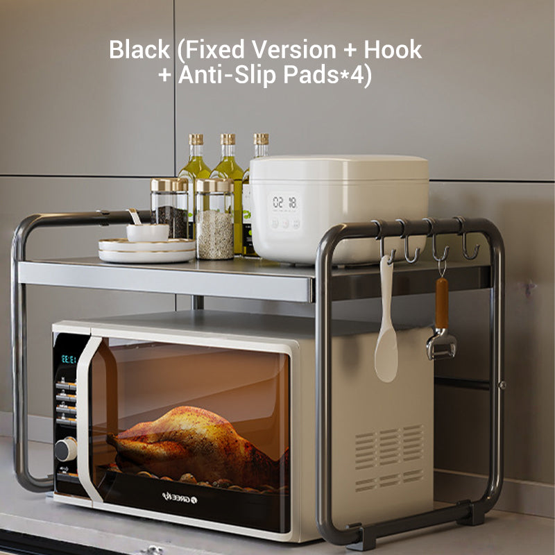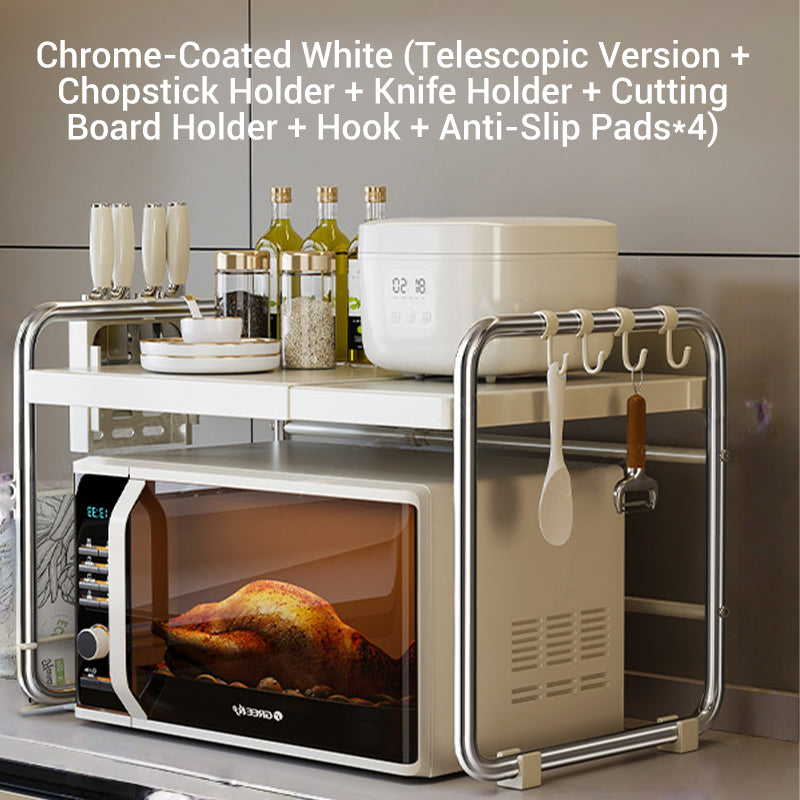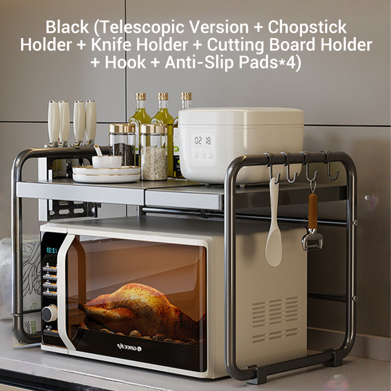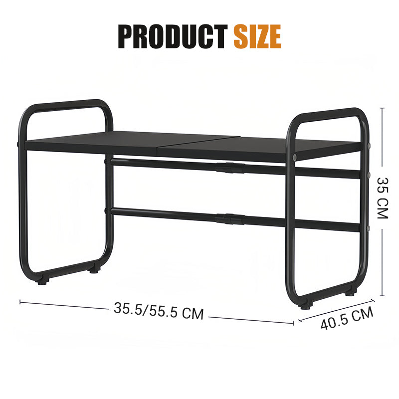 VERSTELBARE LENGTE - Het 2-laags verstelbare magnetronrek heeft een telescopisch ontwerp waarmee gebruikers het frame kunnen uitschuiven of intrekken om perfect in verschillende aanrechtbreedtes te passen. Of uw keuken nu compacte oppervlakken of grotere oppervlakken heeft, de flexibele lengte zorgt voor een optimaal gebruik van de ruimte. De installatie is zonder gereedschap en moeiteloos, waardoor het rek gemakkelijk kan worden verplaatst op basis van de keukenindeling of opslagbehoeften, wat een naadloze oplossing biedt voor ruimtebeheer.