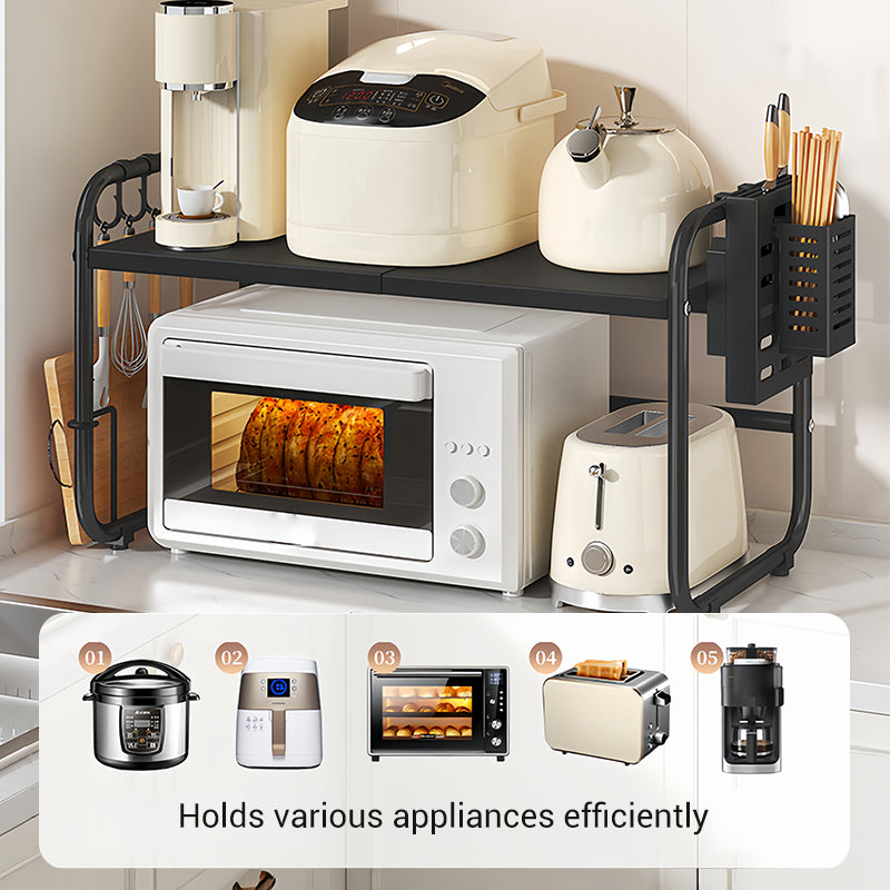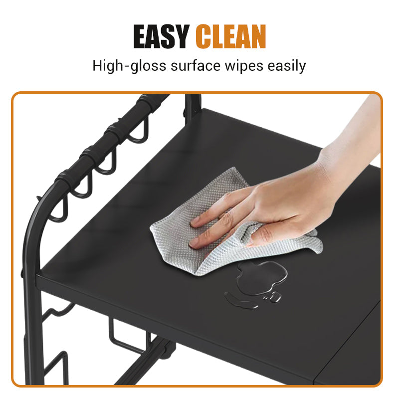 MULTIFUNCTIONEEL - Ontworpen om een verscheidenheid aan keukenapparatuur en opslagcontainers te huisvesten, maximaliseert dit rek de efficiëntie van het aanrecht. Het maakt gelijktijdige plaatsing van magnetrons, blenders, broodroosters of andere apparaten mogelijk, terwijl veelgebruikte items binnen handbereik blijven. Door organisatie te combineren met veelzijdigheid, helpt het rek rommel te verminderen en de maaltijdbereiding te stroomlijnen, waardoor het een essentieel hulpmiddel is voor keukens van elke omvang.