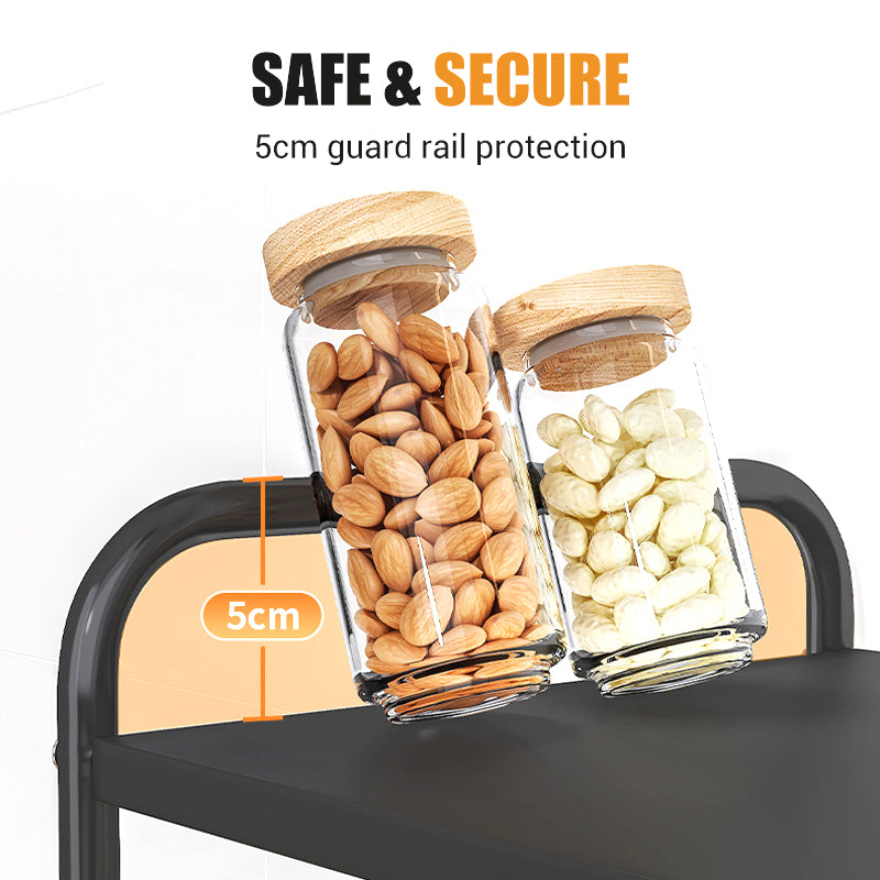 VEILIG en BEVEILIGD – Het rek is voorzien van een verhoogde reling van 5 cm die voorkomt dat items die op de planken zijn geplaatst, eraf glijden. Deze beschermende rail houdt kookgerei, containers en kleine apparaten veilig met behoud van gemakkelijke toegang en bruikbaarheid op het aanrecht. Het ontwerp verhoogt de veiligheid zonder extra ruimte in te nemen of de dagelijkse keukentaken te verstoren.
