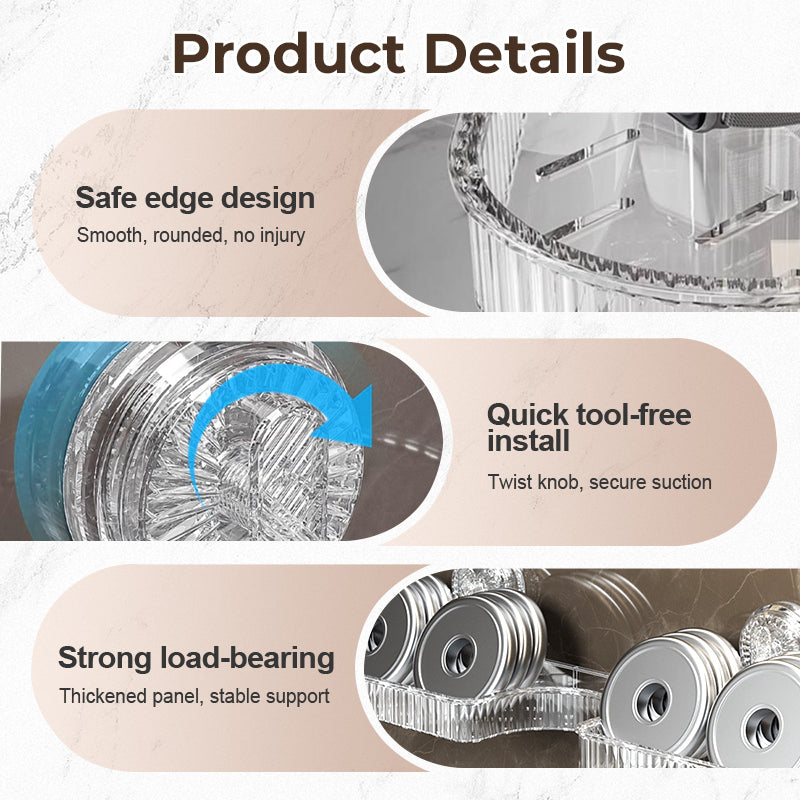 EENVOUDIGE INSTALLATIE ZONDER GEREEDSCHAP: Draai en draai de knop vast om de zuignap stevig vast te zetten. Het ontwerp van de vacuümhechting zorgt voor een sterke stabiliteit zonder muren of oppervlakken te beschadigen. Meerdere, fijn gepolijste randen maken het hanteren veilig, waardoor krassen of handletsel worden voorkomen.
