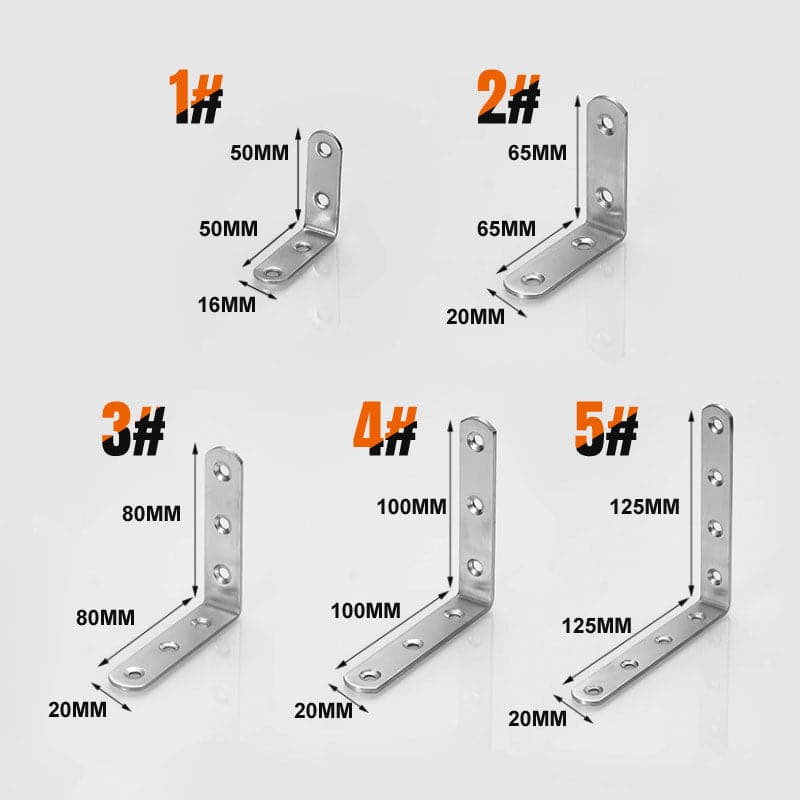 - Ongeëvenaarde kracht: Deze hoekbeugels zijn gemaakt van hoogwaardig roestvrij staal en kunnen de tand des tijds doorstaan. Ze onderscheiden zich door hun robuuste dikte, variërend van 2 mm tot 2,5 mm. Deze zware constructie zorgt voor uitzonderlijke sterkte en duurzaamheid, waardoor ze de perfecte keuze zijn voor het vastzetten van je meubels en constructies..