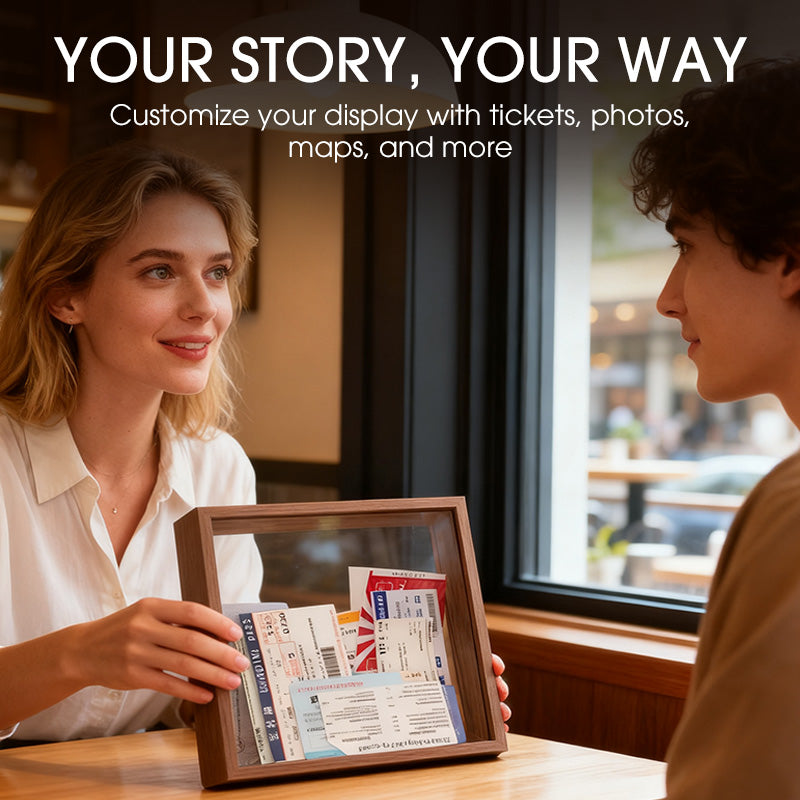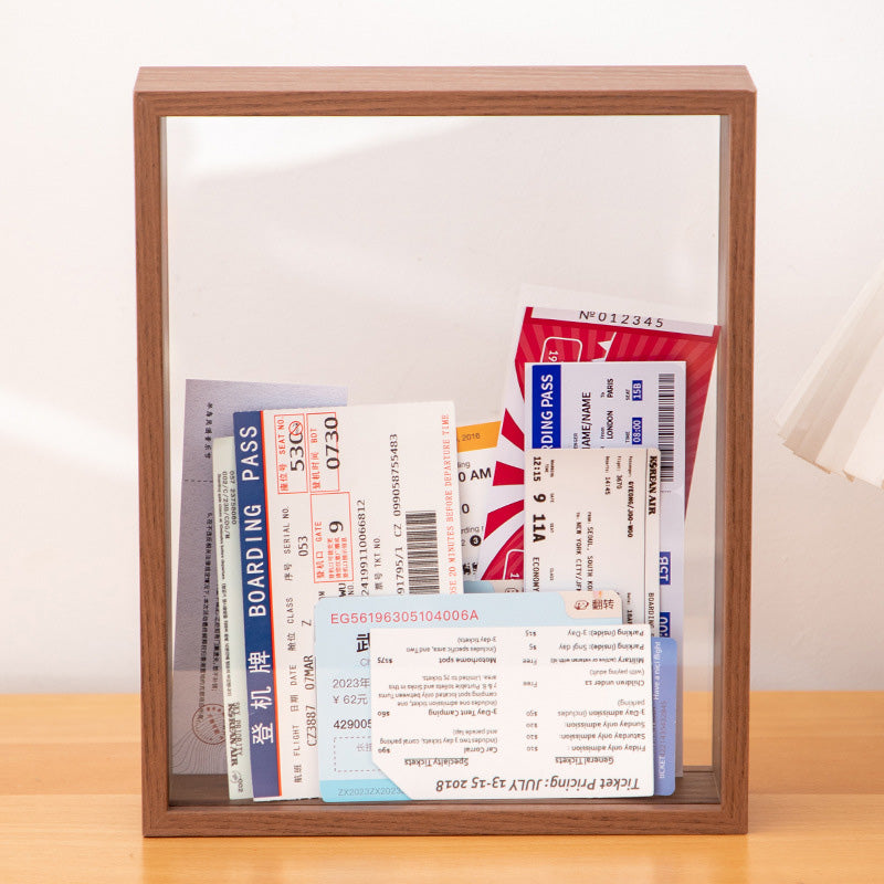 TRANSPARANTE VITRINE - Het doorzichtige voorpaneel biedt een perfect zicht op uw verzamelde herinneringen en verandert uw kaartjes in een uniek kunstwerk dat het verhaal vertelt van uw ervaringen en reizen.